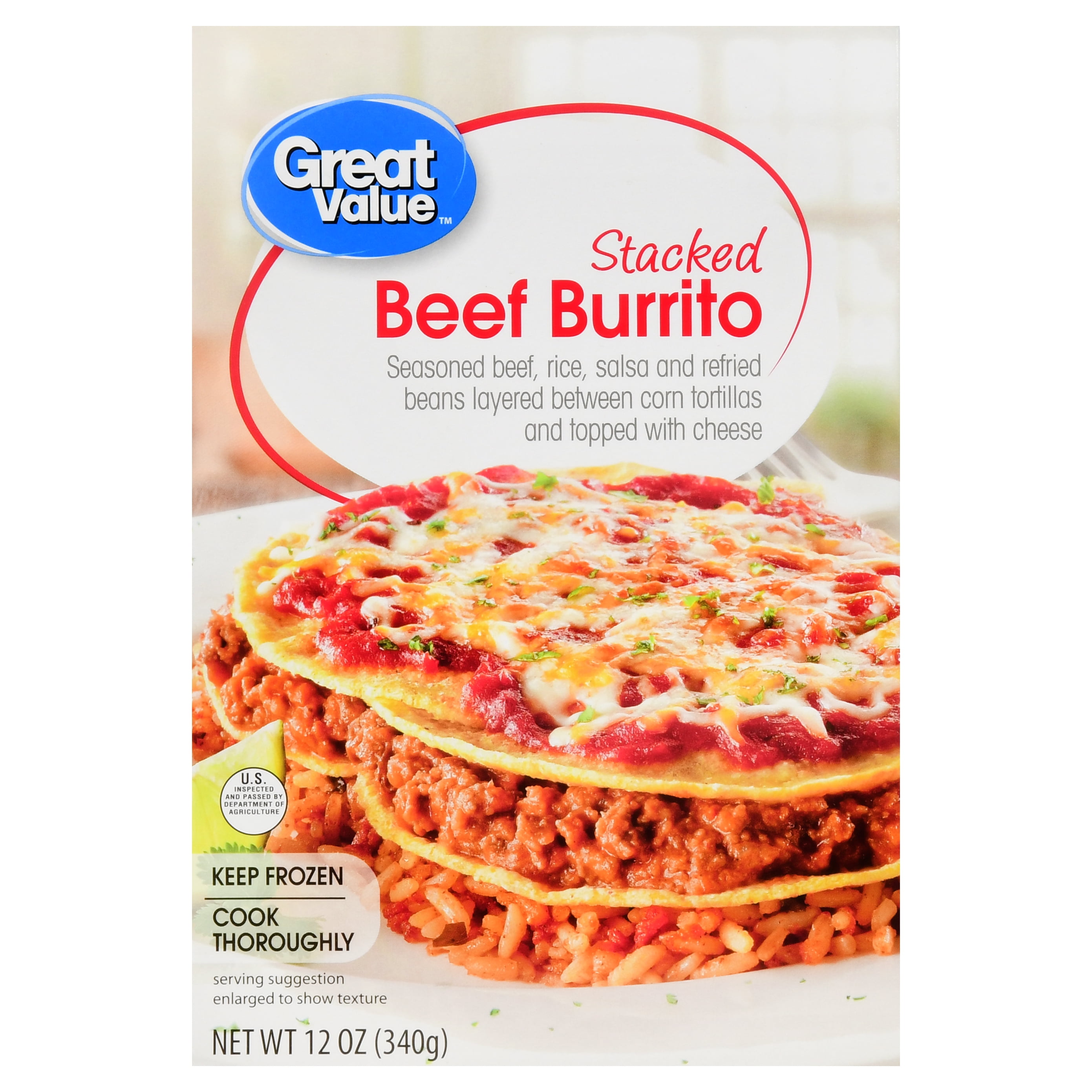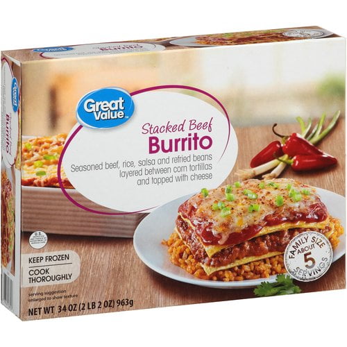 Made with seasoned beef rice salsa and refried beans layered between corn tortillas and topped with cheese. Great value stacked beef burrito 12oz 283. 40 saturated fat 8g trans fat 1g.