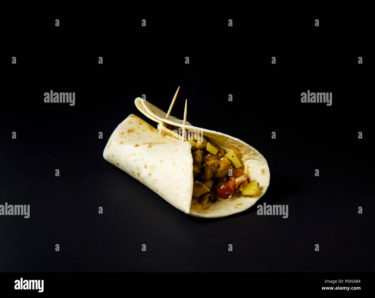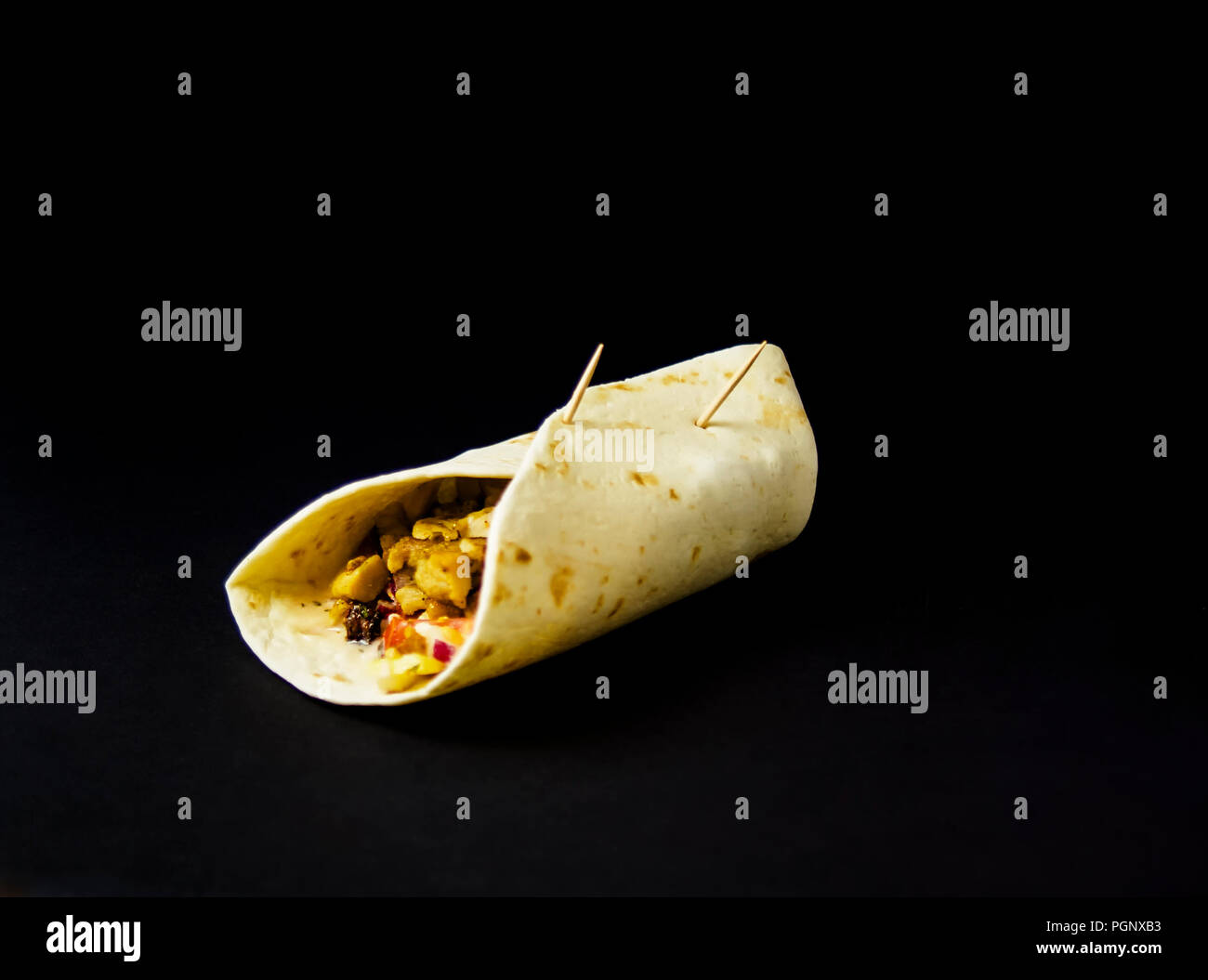 Home Made Burrito With Chicken And Vegetables Isolated On Black